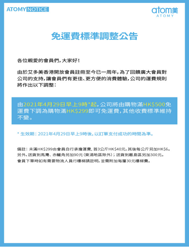 通知:艾多美香港-免運費調整公告
