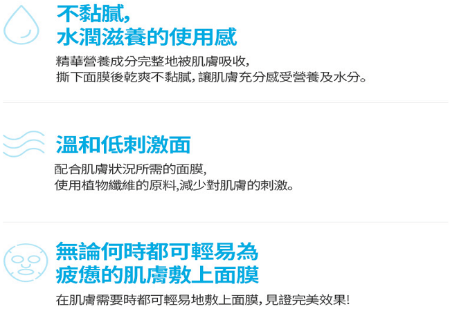 緊緻保濕面膜、亮白水嫩面膜、沁涼舒緩面膜,希望你找到適合當下膚況集中調理。